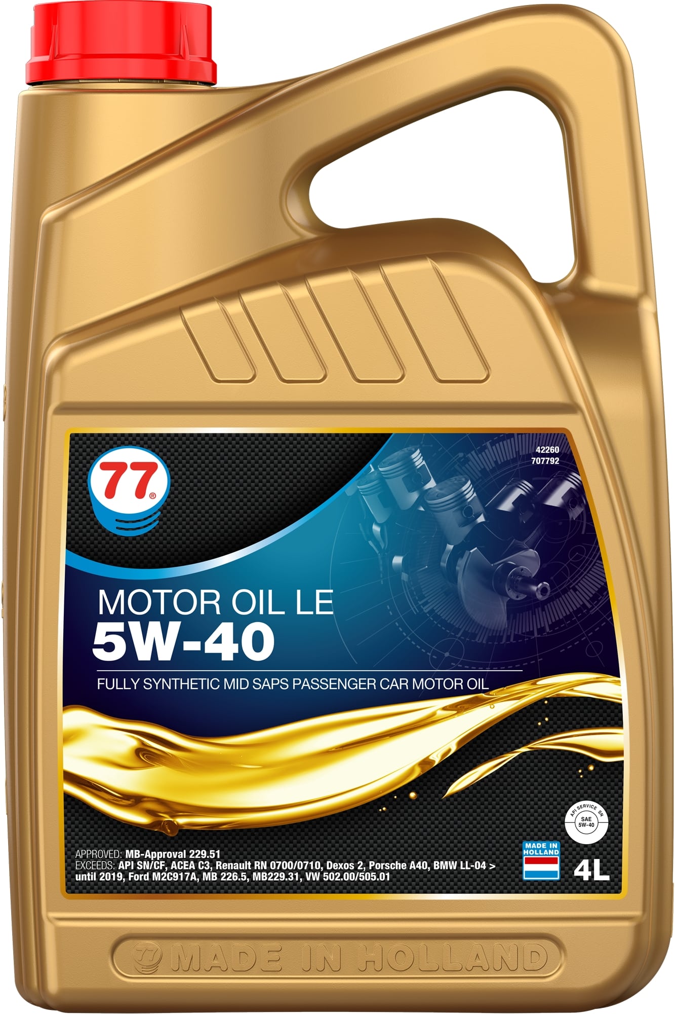 4226 MOTOR OIL LE 5W-40 är en högpresterande bränslebesparande MID SAPS motorolja baserad på 100% syntetisk teknik för användning i den senaste generationens bensin- och dieselmotorer i personbil och lätta skåpbilar med eller utan turboladdare. MOTOR OIL LE 5W-40 är utvecklad för användning i motor som är utrustad med eller utan avgas efterbehandlingssystem.