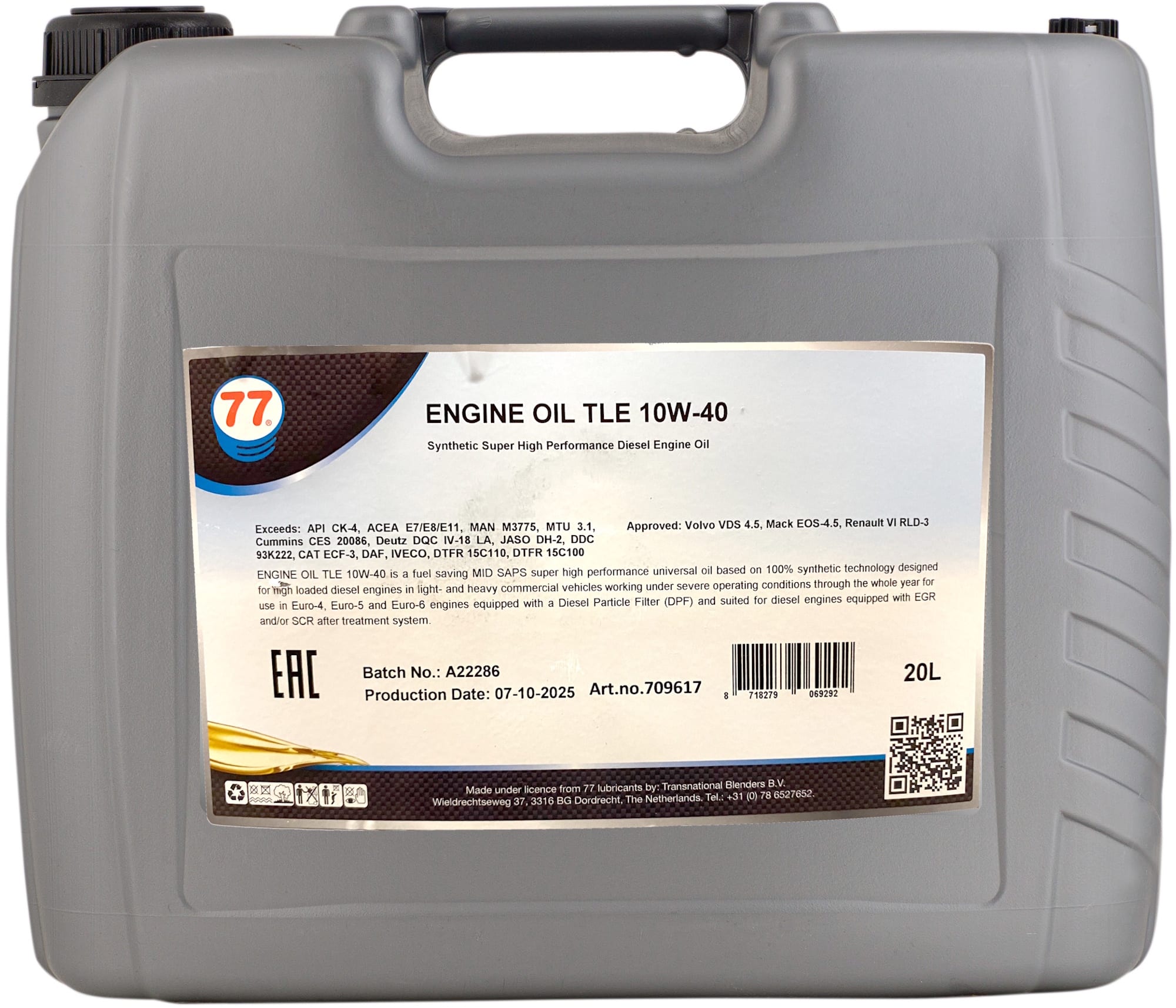 Syntetisk MID SAPS universalolja framtagen för hårt belastade dieselmotorer i lätta och tunga kommersiella fordon som arbetar under krävande driftsförhållanden året runt. Den är avsedd för användning i Euro-4, Euro-5 och Euro-6-motorer utrustade med dieselpartikelfilter (DPF) och är även lämplig för dieselmotorer med EGR och/eller SCR-efterbehandlingssystem. Motorolja TLE 10W-40 är formulerad på högraffinerad syntetisk basolja i kombination med ett speciellt tillsatspaket för att uppnå följande egenskaper: Utmärkt termisk- och oxidationsstabilitet. Mycket god dispergerings- och rengöringsförmåga. Hög skum-, slitage- och korrosionsskydd. Skydd mot cylinderpolering (Bore Polishing). Förlängda bytesintervall upp till 150.000 km. Lämplig för motorer utrustade med dieselpartikelfilter (DPF). Uppfyller följande prestandakrav: Godkänd: Volvo VDS 4.5 Mack EOS-4.5 Renault VI RLD-3 DTFR 15C110 Uppfyller eller överträffar följande standarder: API CK-4 ACEA E7 / E8 / E11 MAN M3775 MTU Type 3.1 Cummins CES 20086 Deutz DQC IV-18 LA JASO DH-2 DDC 93K222 CAT ECF-3 DAF IVECO DTFR 15C100 (motsvarar MB 228.51 / MB 228.31)