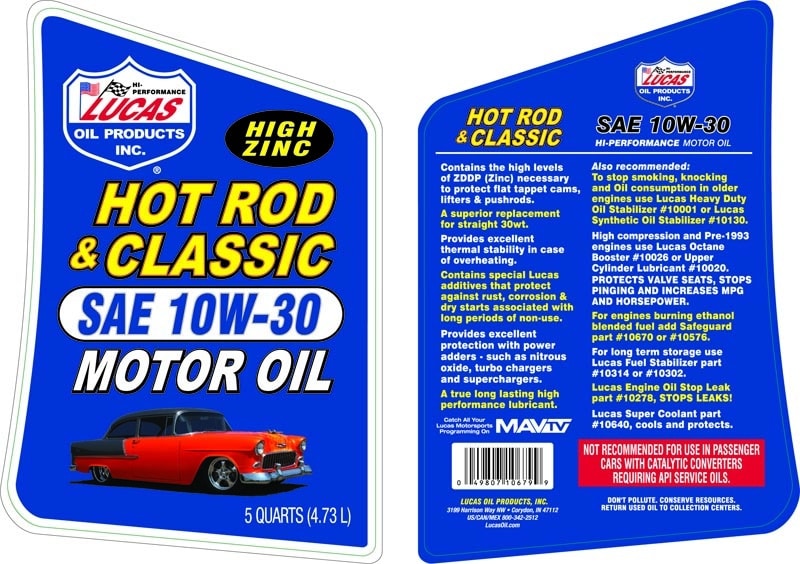 Lucas Hotrod & Classic olja är tillverkad med paraffinbaserade basoljor av högsta kvalitet och är förstärkt med ett unikt tillsatspaket som innehåller höga halter av zink, molybden och fosfor, vilket ger en segare, tjockare tillsatsfilm för maximalt skydd även under de svåraste förhållandena. Det förbättrar filmhållfastheten mellan cylinderväggen och kolvringar, minskar oljeförbränningen och förbättrar trycket i slitna motorer. Den har goda kalltemperaturegenskaper och tål höga driftstemperaturer och är kompatibel med metanol och alla racingbränslen, såväl som med syntetiska och icke-syntetiska oljor. Denna 10W-30 mineralolja är designad för klassiska muskel-och utställningsbilar utan katalysatorer. Kan användas i racingapplikationer men rekommenderas inte för personbilsanvändning. Formuleringen är perfekt för Hot Rods och Klassiska bilar med ett ökat zinkvärde på 2100 PPM. Eftersom många av dessa mycket speciella maskiner ofta står avställda under långa perioder (t.ex. vintertid i vissa delar av landet), har ett antal av komponenterna i tillsatspaketet som används i Lucas Marine-oljor för att ge rost- och korrosionsskydd inkluderats i den unika formeln.