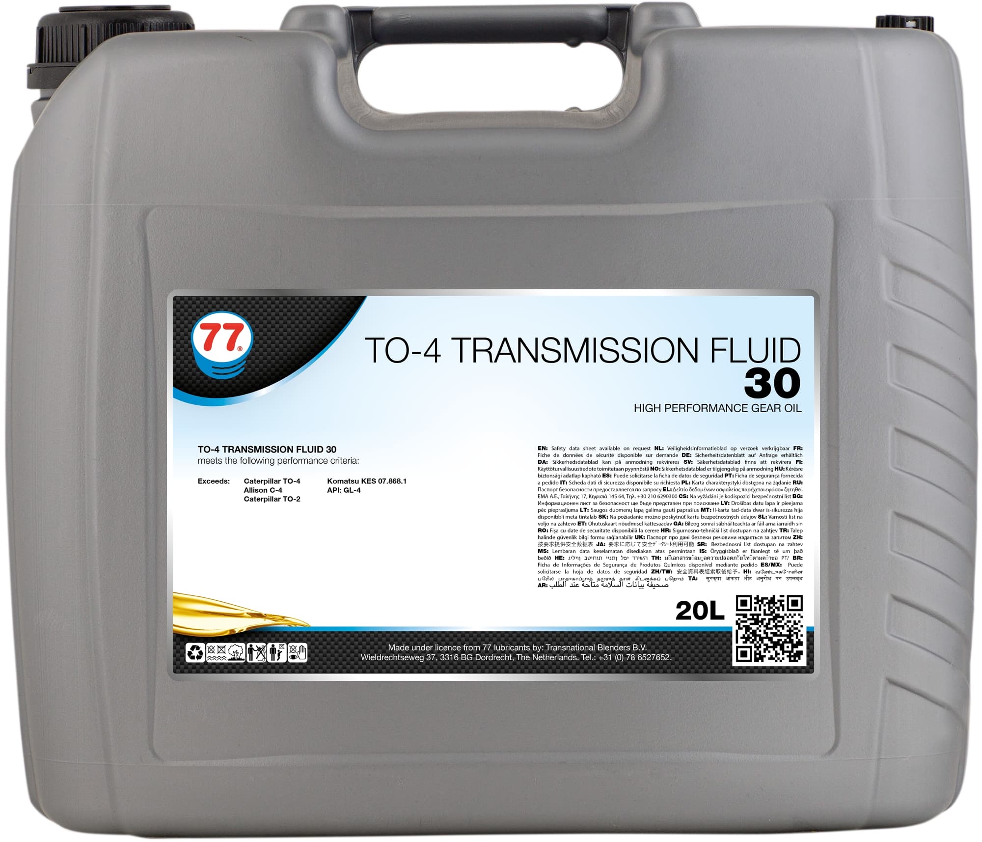 TO-4 Transmission Fluid 30 är utvecklad speciellt för powershift transmissioner, slutväxlar och våta bromsar på tunga entreprenadmaskiner som används i mark-, gruv- skog vägtransporter och lantbruk. Produkten är en blandning av förstklassiga basoljor och speciellt utprövade additiv för att ge bästa skydd mot slitage, utökad oxidationsstabilitet, bra friktionsegenskaper samt rost och korrosionsskydd. Uppfyller följande prestandakriterier: Caterpillar TO-4 Caterpillar TO-2 Allison C-4 API GL-4 ZF TE-ML 03C Komatsu Dresser Vickers I-286-S Vickers M2950S ZF TE-ML 07D, F Komatsu KES 07.868.1 DANA Powershift-transmissioner