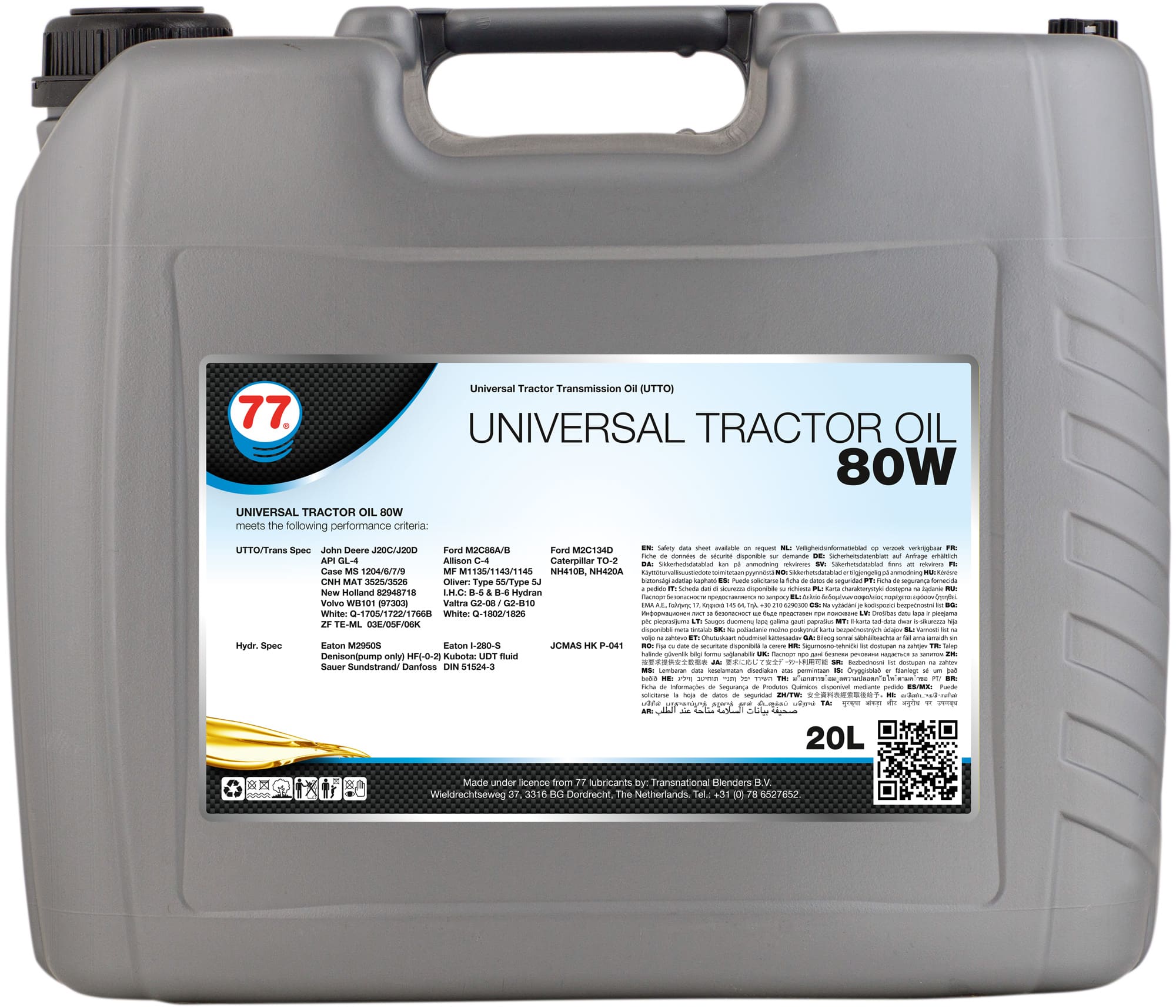 Universal Tractor Oil 80W (UTTO- olja) för användning i transmissioner, hydraulsystem och våta bromsar på traktorer och arbetsmaskiner Oljan möter specifikationerna från ledande tillverkare av utrustningar till traktorer -Förbättrade friktionsegenskaper optimerar kopplingsfunktion och minimerar oljud i våta bromsar. -Högt viskositetsindex kopplad till god skjuvstabilitet garanterar konsistent prestanda. -Utomordentligt goda låg temperaturegenskaper ger snabb reaktion och effektiv smörjning vid låga temperaturer. -Bra AW och EP egenskaper minskar slitaget, förlänger livslängden på utrustningen och minskar underhållskostnaderna -Multifunktionsförmåga ger rationaliseringsmöjligheter och minskar därmed risken för sammanblandning och felaktig applicering. -Använd INTE Universal Tractor Oil 80W i motorer Uppfyller följande prestandakriterier: UTTO-/Transmission Specifikationer: John Deere J20C/J20D API GL-4 Case MS 1204/6/7/9 CNH MAT 3525/3526 I.H.C: B-5 & B-6 Hydran White: Q-1705/1722/1766B ZF TE-ML 03E/05F/06K/17E/21F Ford MC268A/B Allison C-4 MF M1135/1143/1145 Oliver: Typ 55/Typ 5J Volvo WB101 (97303) White: Q-1802/1826 Ford M2C134D Caterpillar TO-2 NH410B, NHA20A New Holland 82948718 Valtra G2-08 / G2-B10 Hydrauliska specifikationer: Eaton M2950S Denison (endast pump) HF-0/-2 DIN 51524-3 Eaton I-280-S Kubota: UDT-vätska Sauer Sundstrand/Danfoss JCMAS HK P-041